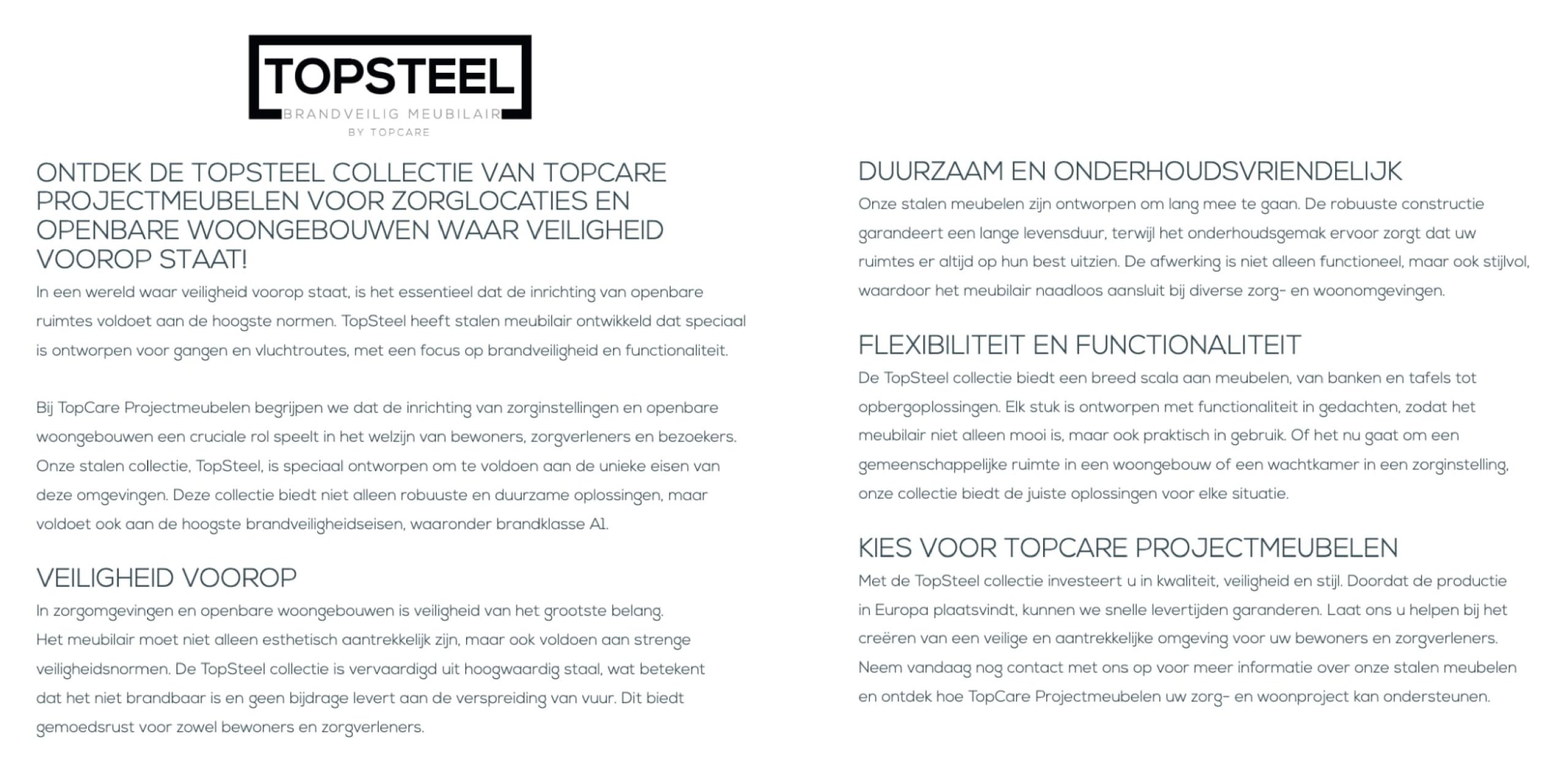Ontdek de Topsteel collectie van TopCare projectmeubelen voor zorglocaties en openbare woongebouwen waar veiligheid voorop staat!
